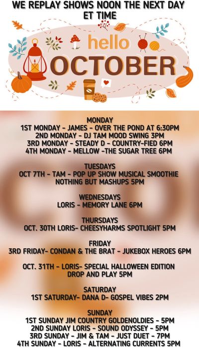 Check our Schedule for Guest Dj's and Pop UP shows. Oct. 7 - Musical Smoothie - MashUPs ONLY - 5pm est.